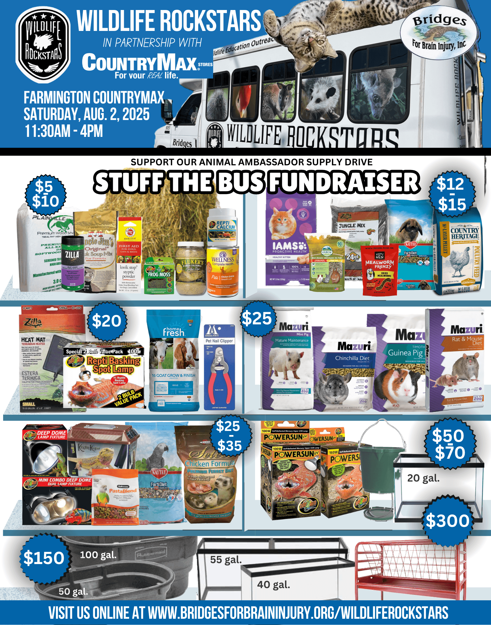 We're teaming up with our friends at CountryMax for our first ever Stuff the Bus event! We'll be at the CountryMax in Farmington all day taking donations from our wishlist so we can continue to provide top notch care and enrichment for our animal ambassadors. Our wishlist contains items ranging from $5 to $300 so no donation is too small, and all are appreciated!